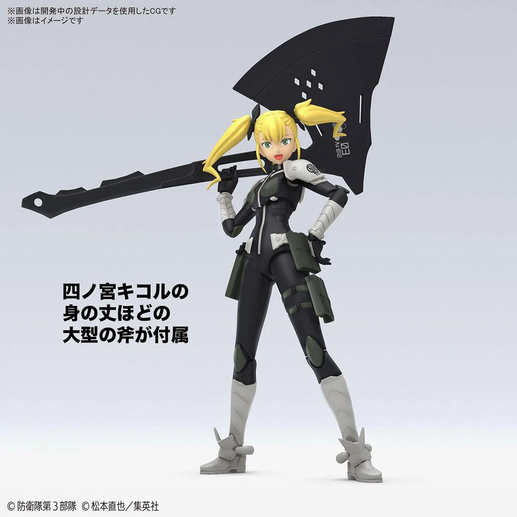 The Kikoru Shinomiya figurine from "Kaiju No. 8" in the Figure-rise Standard collection (model) transforms this character into a three-dimensional figurine of approximately 20 cm, taking advantage of his slender form and his rich weaponry for a representation full of 'action. The kit includes four types of faces, one with tampo printing and three with water decals, and includes one with a mask. The set is rounded out with various weapons, including pistols, a basic rifle, and a gigantic axe, as well as knuckles for an action base and expressive hands.